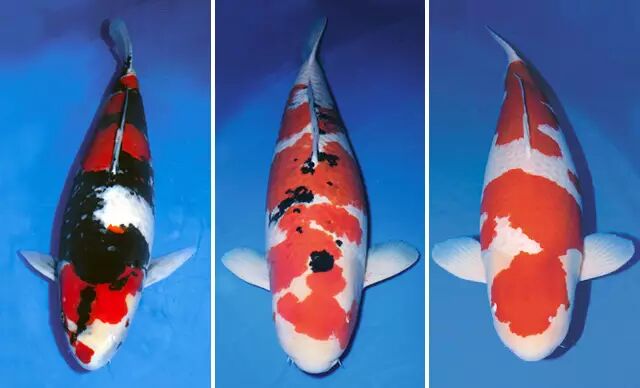 三种影响力最大的锦鲤,从左自右依次是昭和三色、大正三色与红白。图片:日本爱鳞会