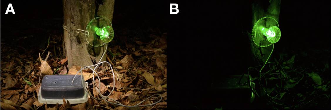 随后,研究者制造了一些“人造蘑菇”,并在其内部安置了与“椰子花”发光波长相同的LED灯。三十八个这样的蘑菇被放置在野外,一半开灯,一半关灯。五个夜晚过去后,研究者发现,相较于LED灯关闭的人造蘑菇,开灯时的人造蘑菇展现出了很强的吸引昆虫的能力,慕“光”而来的那些昆虫,也都具有感知绿光的能力。因此,研究者推测,“椰子花”这一受生物钟调控的荧光有着重要意义:在黑暗中吸引昆虫,帮助其传播孢子,从而利于自身的繁殖。
