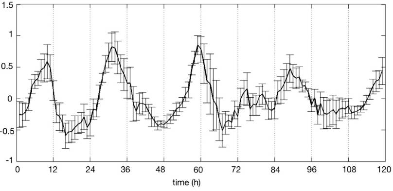 经四十八小时导引后,荧光蘑菇菌丝在持续黑暗、25℃条件下六天之内的荧光强度变化,呈现出周期约为二十二小时的近昼夜节律。即便培养温度改变至21℃和29℃,周期也只表现出细微改变。