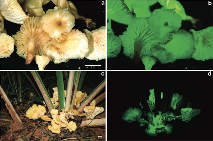 蘑菇发光并不是什么新鲜事。早在2000多年前,亚里士多德就曾经观察到蘑菇的发光行为。其中,“夜空下最亮的菇” Neonothopanus gardneri也于1840年被苏格兰博物学家乔治·加德纳(George Gardner)发现。他注意到巴西当地的男孩们在用这种蘑菇嬉戏玩耍,上前询问后得知巴西人称呼它为“flor-de-coco”,意为“椰子花”。这种“椰子花”后来从人们的视线中消失了,到2005年才被重新发现。