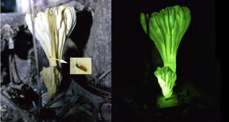 荧光蘑菇在照明下(左)和在暗处(右)的照片对比。左图小框中展示了一只被吸引来的隐翅虫。