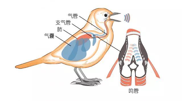 而对于鸟类来说,它们的主要发音部位并非在喉部,而是位置更靠下方的气管-支气管交界处。在这里,环绕气管、支气管的环状软骨扩大,形成了一个较大的管状空腔,称为鸣管。