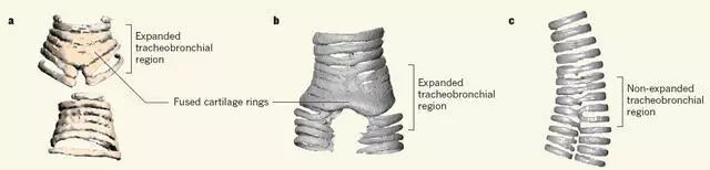 维加鸟(左)的气管-支气管连接处结构和现存的疣鼻栖鸭(中)类似,但与短吻鳄(右)显著不同。图片:O'Connor PM Nature (2016) 538:468–469
