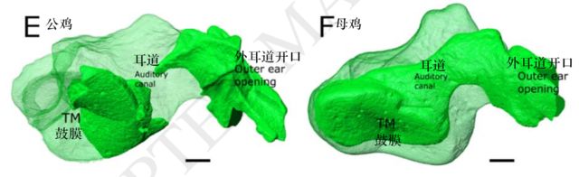 与此同时,对鸡头标本的显微CT扫描结果揭示了公鸡抗噪音的绝招。原来,公鸡的外耳道在张嘴和闭嘴状态下完全不一样。公鸡在打鸣时,上喙会张至最大,这一动作能够放松鼓膜,使1/4的外耳道完全关闭,下垂的软组织还可以覆盖住50%的鼓膜,相当于把耳朵由内而外地捂得严严实实。