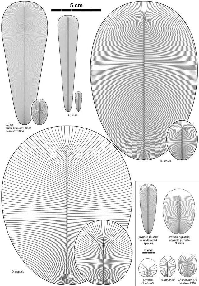 几种常见的狄更逊水母背部轮廓图。图片来源:Aleksey Nagovitsyn / wikimedia