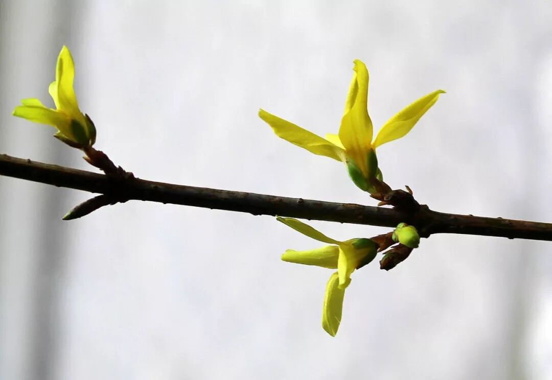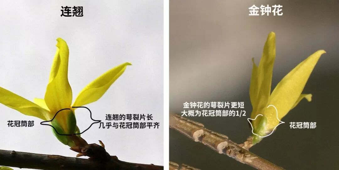 许多植物园和花园兼有连翘和金钟花,一眼看去很难分辨。在外形上,可以说花大的是连翘,花小的是金钟;也可以说花萼裂片长的是连翘,短的是金钟。但这些特征都有点主观,不怎么靠谱,最靠谱的方法是随身带把小刀。