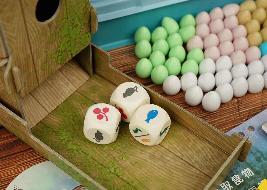 5颗木质食物骰子,入手很有质感,摩挲起来也很光滑,不存在木刺扎手,玩起来很安全。每一面的图案印花清晰,颜色鲜艳,代表了鸟儿们喜欢的各种食物。