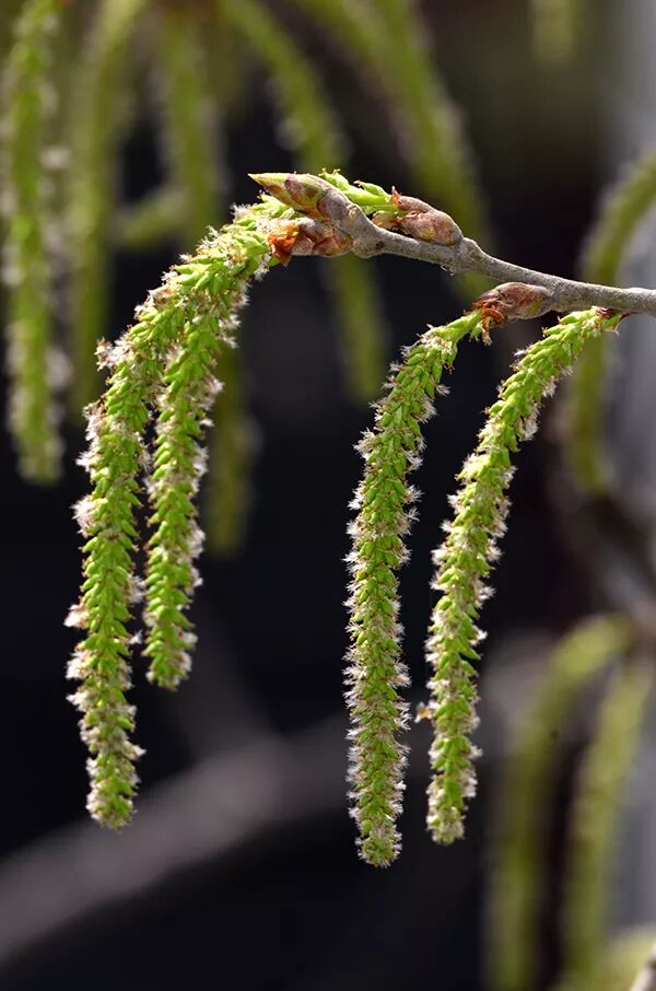 每年早春二月,草长莺飞,毛白杨的花芽开始萌发。作为杨柳科的一员,它也是葇荑[róu tí]花序,许多朵无柄小花在花序轴上开成一串,传粉后整个花序一起凋落。