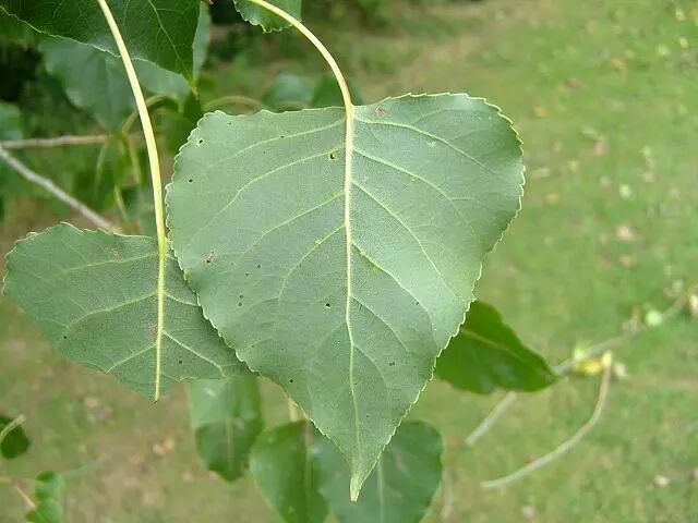 杨树叶柄中的输导组织和机械组织发达,韧性好,所以是玩拔根儿的良材,而泡桐和悬铃木的叶子,叶柄看着五大三粗,实则不堪一击。拔根儿用的杨树叶,以加拿大杨为佳,毛白杨次之——小时候我们都没学过植物学,可是却能准确分辨出加拿大杨和毛白杨的叶,因为毛白杨叶片近似心形,叶缘的锯齿呈波浪状,而加拿大杨叶片更像三角形,叶缘锯齿小而密。