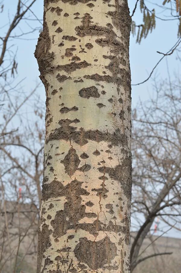毛白杨的树皮;老树的下半截树干是褐色的。图片:不认识植物;沙漠豪猪