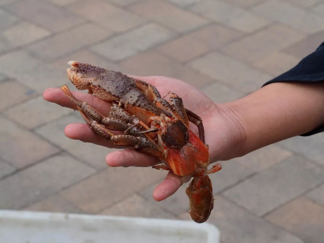手中的大寄居蟹(P. ochotensis),注意它的螯足。图片:张小蜂