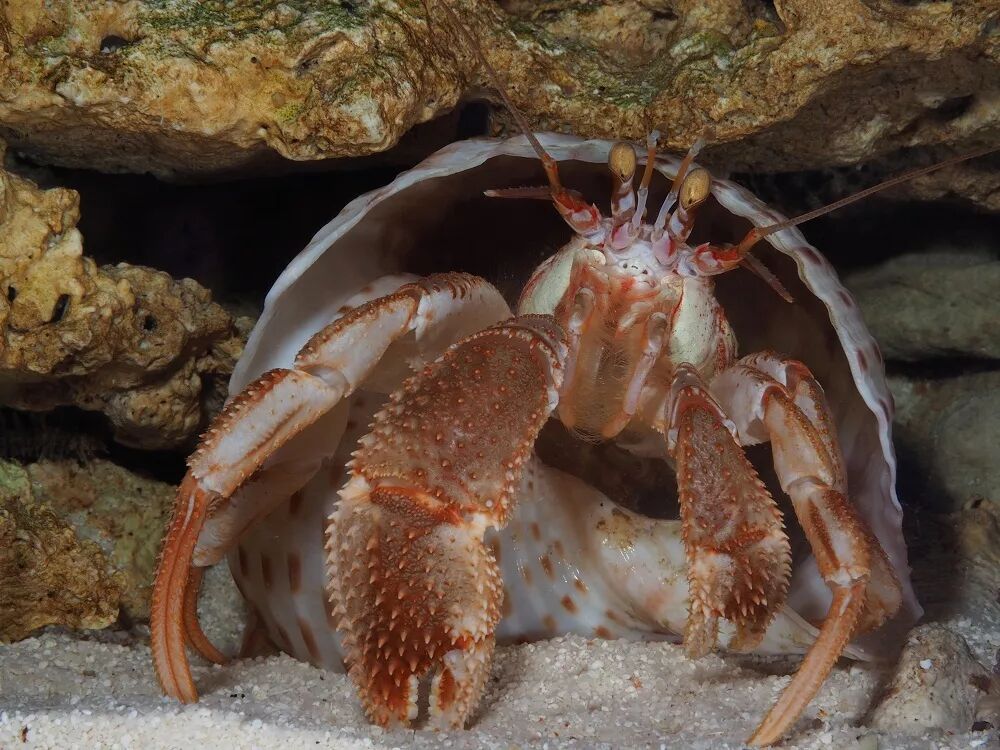 大指寄居蟹头胸甲最长可达3厘米,甲宽2.5厘米,这还不算它们能够伸展开的触角、复眼及足,相比那些礁石区常见的整个身子也不过3、4厘米的寄居蟹,大指寄居蟹可算得上是大块头了。
