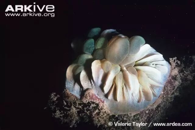 夜晚,收起囊胞的泡囊珊瑚,石灰质骨骼清晰可见。注意它也是可以分泌形成石灰质骨骼的,所以才能造礁。图片:Valerie Taylor / ardea.com