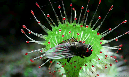 这其中,茅膏菜属是种类最多的属,大约有200个物种,大多生活在沼地等潮湿环境里,它们最大的特点就是叶表面长满腺毛,腺毛顶端有黏液,这是它们的捕虫工具。大部分茅膏菜的腺毛可以动,昆虫落到叶片上以后会被粘住,附近的其它腺毛也会慢慢向昆虫弯曲靠拢,让含有消化酶的黏液尽可能地接触到猎物。