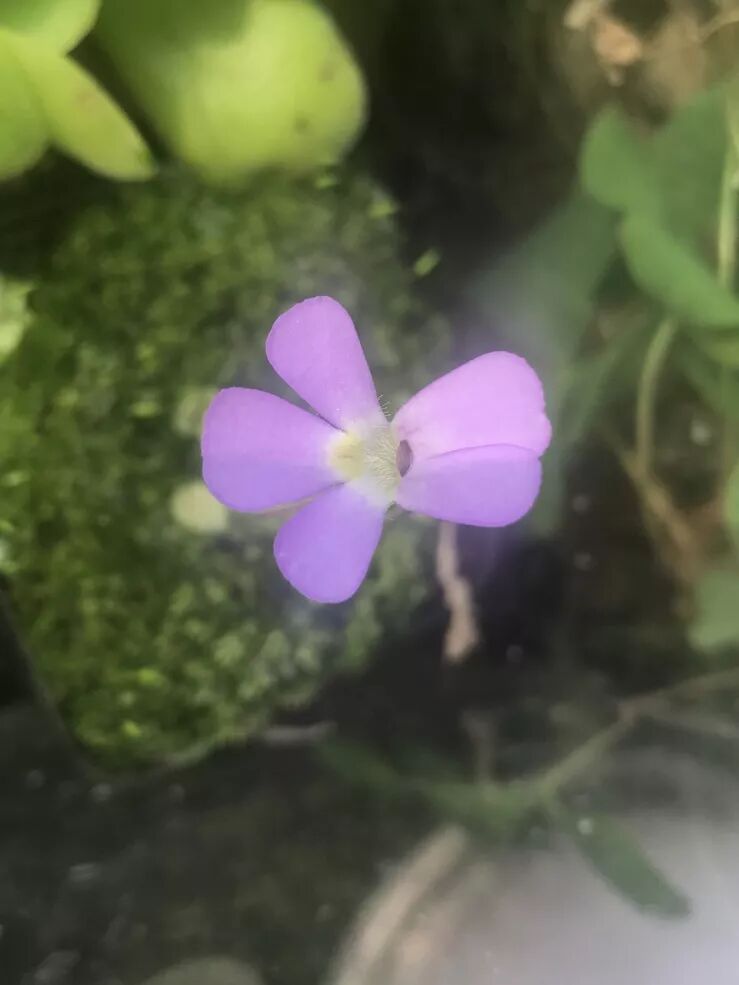狸藻的捕虫囊,只能捕捉非常微小的水生动物,一般看不见。不过狸藻科里还有一类捕虫现象很明显的,那就是捕虫堇,它们大多生活在凉爽的潮湿山地,叶片表面布满黏液滴,靠它粘虫子,是控制蕈蚊的利器,我家里的几盆,一夏天总能粘住几百只。捕虫堇的主要看点还不是粘虫子,而是花,它们的花形状像堇菜的花,捕虫堇这个名字大概就是这么来的。