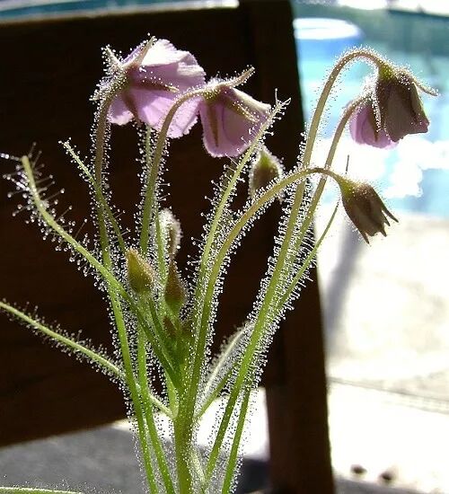 捕虫堇捕虫的效率虽然高,但我觉得它还算不上最高,要说小飞虫杀手,那还是得数腺毛草。最常见的腺毛草是丝叶腺毛草Byblis filifolia,也叫丝叶彩虹草,它们的外形长得就像个鸡毛掸子,细长的茎叶上全都是黏性腺毛,是一个立体的陷阱,小飞虫沾上就逃不掉。密密麻麻的黏液会在阳光下反射出虹彩,彩虹草一名就由此而来。丝叶腺毛草很容易种活并且开花,不过它是一年生植物,入冬后就会死亡。