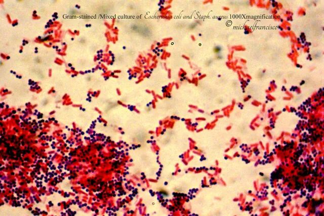 革兰氏染色后呈红色的大肠杆菌和呈蓝紫色的金黃色葡萄球菌(放大1000倍)。图片:Michael R Francisco / flickr