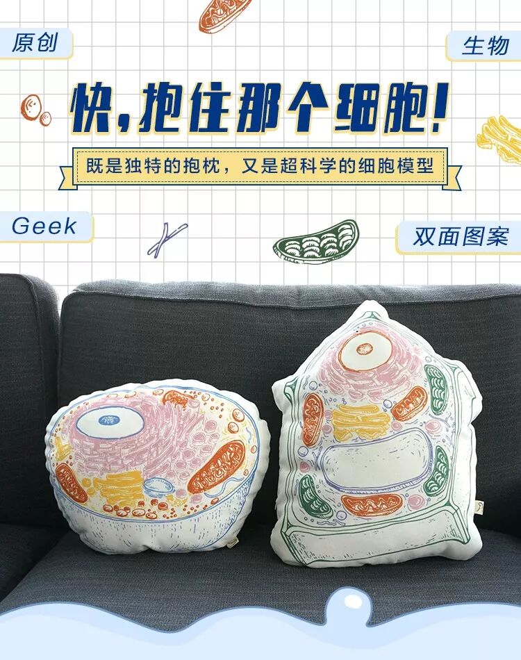现在,果壳商店把动物细胞和植物细胞美味的亚显微结构,画在了抱枕上。超有意思的Geek风抱枕,凸显你非凡的品味,顺带让每一个来拜访你的朋友,都不再忘记生物老师的谆谆教导!