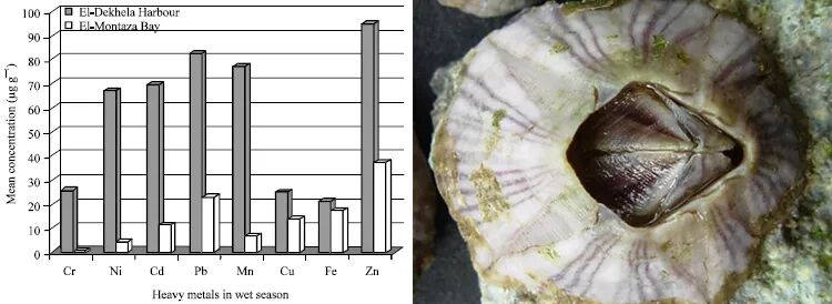 一项研究发现,在检测的几种重金属中,纹藤壶(A. amphitrite)的软组织对锌的富集能力最强。图片:S. Al-Farraj et al. / Research Journal of Environmental Sciences(2011);Auguste Le Roux / wikimedia