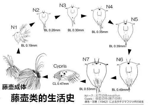 藤壶的生活史。图片:藤永元作,笠原昊 / タテジマフジツボの飼育と形態.動物学雑誌(1942);汉化:千野youko