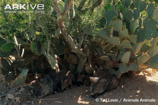 炎炎夏日,在仙人掌的树荫下乘凉休息的领西貒。图片:Ted Levin / Animals Animals / arkive.org