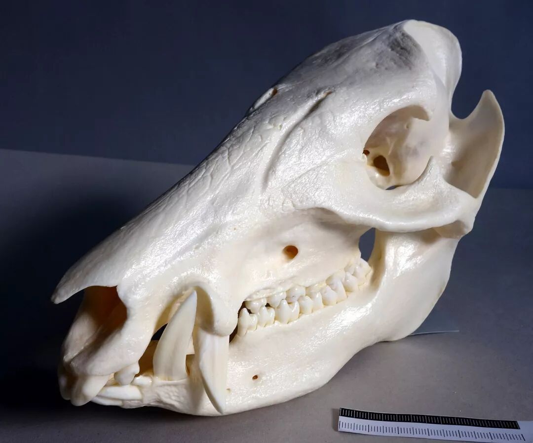 看看领西貒的犬齿。它们的英文名之一“javelina(标枪)”,就来源于它们锋利的牙齿。图片:Klaus Rassinger, Museum Wiesbaden / wiki commons