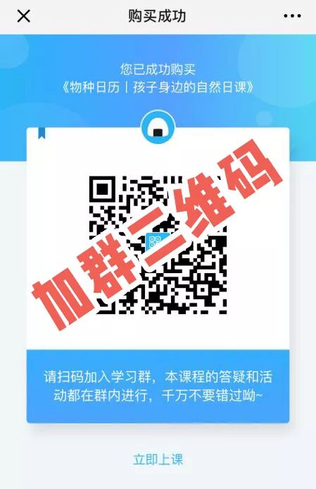 Step 4. 支付成功,点击“立即上课”即可查看课程内容,还可以扫描二维码添加小团子微信,加入课程微信群,和同样热爱自然的朋友们一起学习。
