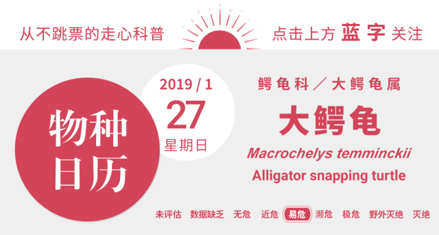 小鳄龟古怪的样貌和暴躁的性格给人留下深刻的印象,但今天日历的主角并不是它,而是它的表亲大鳄龟(Macrochelys temminckii)。