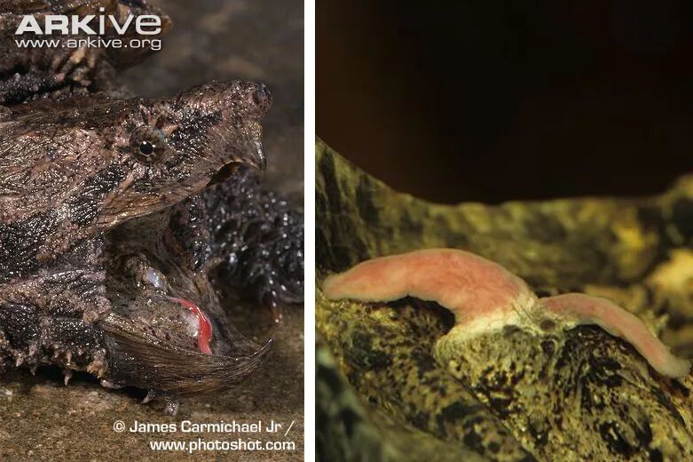 但就算是休息时间也不能浪费,大鳄龟还有一种独特的诱捕技巧,在它们的舌头上有两条蠕虫状突起,当它张开大口时会由灰色转为鲜艳的粉红色,缓缓扭动的样子好似挣扎的蠕虫,引得鱼儿自投罗网。