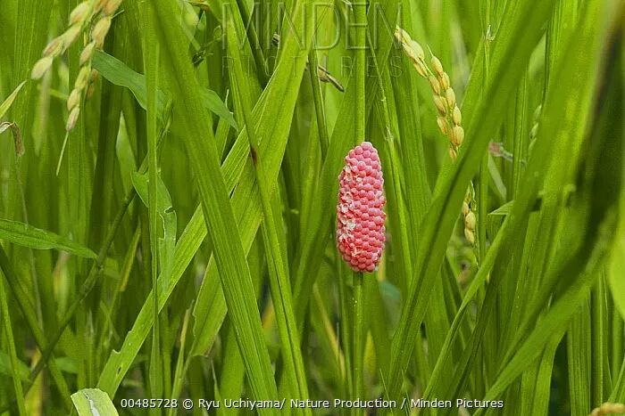 水稻田中的福寿螺卵块。图片:Ryu Uchiyama / Nature Prodution