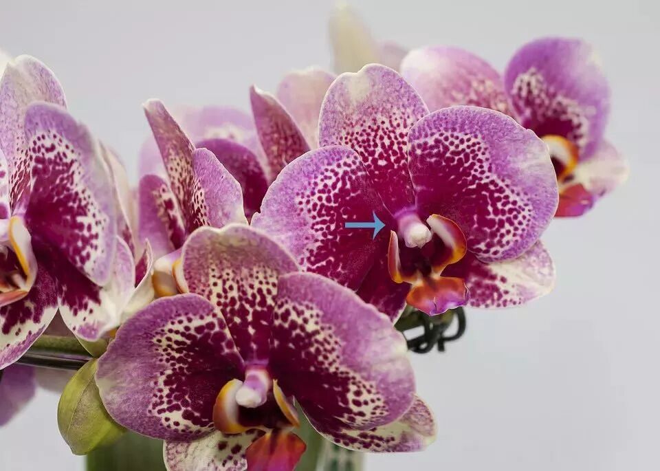 蝴蝶兰正面观,箭头所指是它的合蕊柱。图片:pixabay