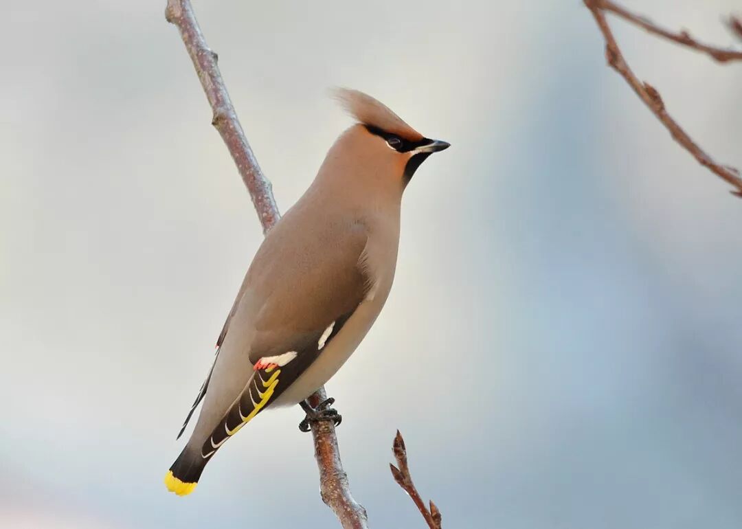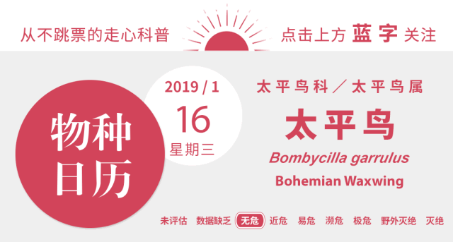 我第一次见到太平鸟(Bombycilla garrulus)是在2010年12月的北京植物园里,它们有着帅气的“莫西干”发型,灰褐色的身上染有粉色,十分引人注目。它们还有黑色的“眼罩”和喉部,黑色的双翅上各带两块醒目的白色翅斑,附近的一小块红色区域由红色的蜡质次级飞羽端构成——太平鸟英文名中的“waxwing”便源于此。