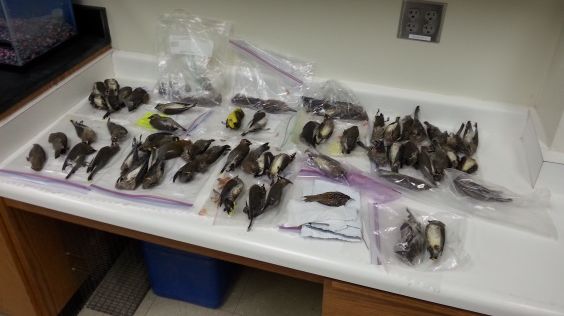 在2015年秋季的犹他州立大学宾馆(Utah State University Inn),短短两天内就有60多只雪松太平鸟因撞上了玻璃而死亡。图片:Samuel Cowell et al. / Nature Resources(2017)