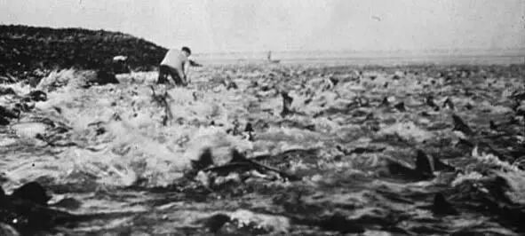 这是1934年2月拍摄的产卵场景,主角是直鳍犬牙石首鱼(Cynoscion othonopterus)。这张照片此前一直被误认是加利福尼亚湾石首鱼产卵的场景,它们的产卵场景与图中情形非常是类似。图片:L. M. Huey
