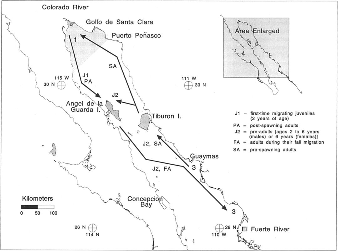 加州湾石首鱼的洄游路线。图片:Miguel A. Cisneros-Mata et al., Society for Conservation Biology, 1994