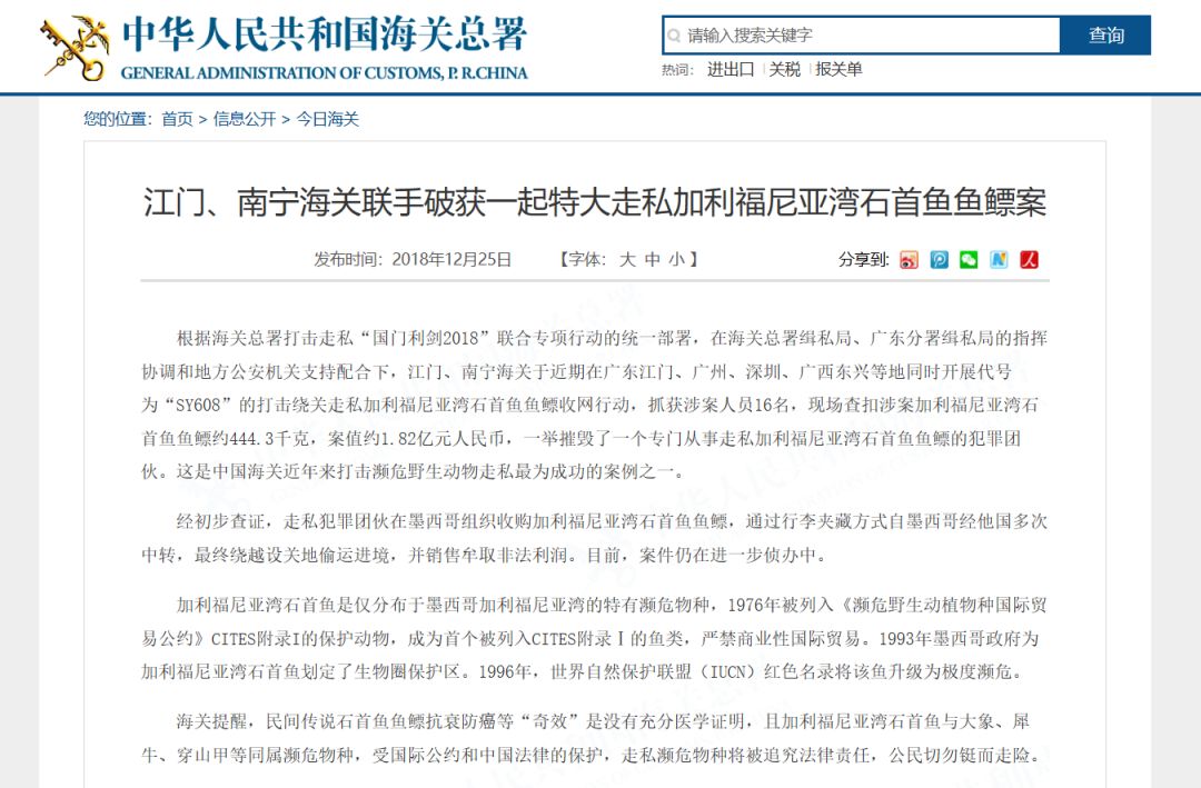 当在大家还沉浸在圣诞元旦带来的节庆气息中的时候,2018年12月25日,中国国家海关总署公布了一则重要信息:江门、南宁警方联合破获了一起重大野生动物制品走私案。犯罪分子集团将444.3千克加利福尼亚湾石首鱼干鱼鳔从墨西哥非法走私到我国,16名涉案人员被抓,案值约1.82亿人民币。