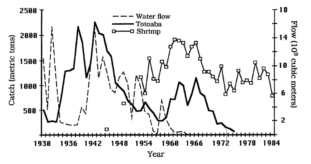 科罗拉多河水流量(虚线)对于石首鱼捕捞量(粗实现)和虾类捕捞量(细实现)的影响。图片:Miguel A. Cisneros-Mata et al., Society for Conservation Biology, 1994