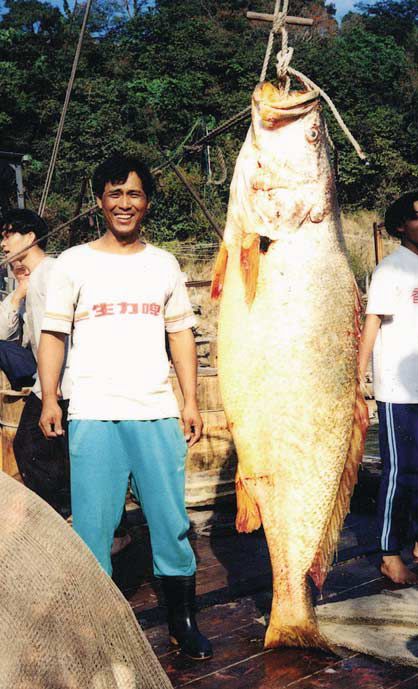 一张1993年的老照片。图中是一条体长超过2米的黄唇鱼,胸鳍腋下的黑色斑点是一大特征。图片:Cheng Tai-sing