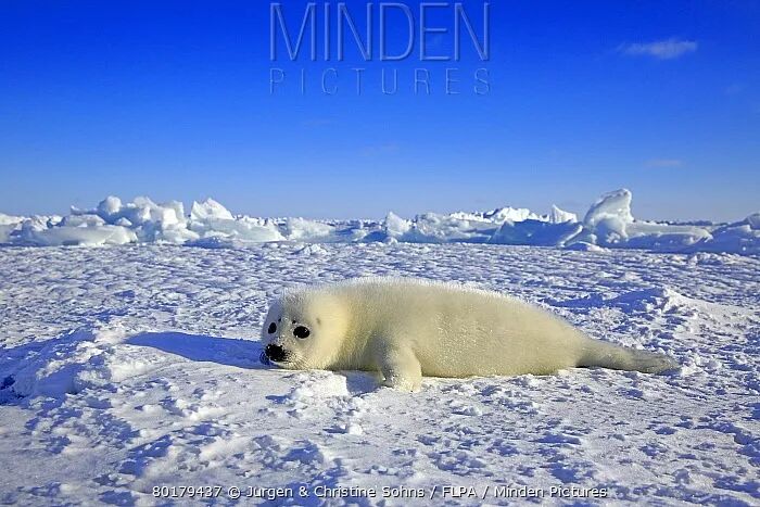 “白袍海豹”,是后来皮毛商人对琴海豹和灰海豹(Halichoerus grypus)幼崽的统称。在初生的前两周,小琴海豹身披纯白色的长绒毛,对于在冰面诞生的它们来说,这是最好的保护色和防寒服。此后,小琴海豹还要经历两次褪毛,最终才能在一年多后转变成和父母们一样,以灰色为基底、带有竖琴状斑块的样貌。