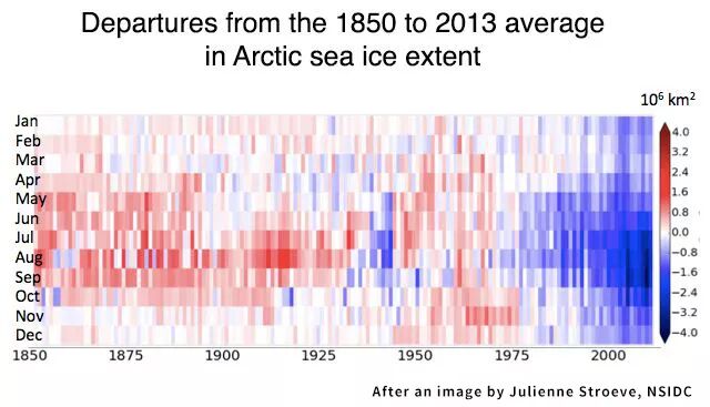 1850~2013年,泛北极地区海冰范围距平值分布图;横轴是年份。颜色越蓝表示海冰越少。图片:J. E. Walsh et al. / Geographical Review(2016)