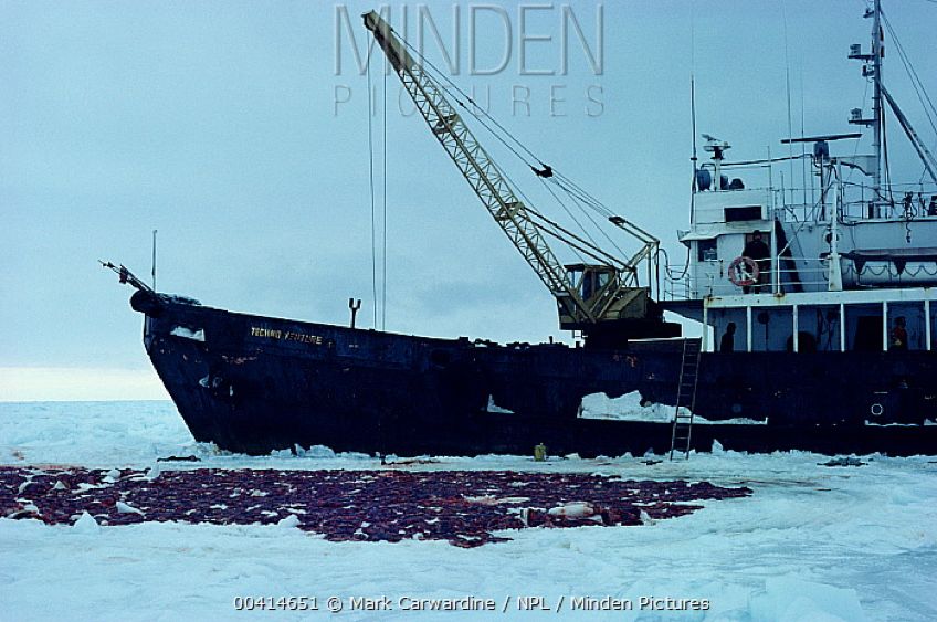 加拿大的琴海豹猎捕母船,近处雪地上堆积着已经被剥了皮的琴海豹尸体。图片:Mark Carwardine / NPL / mindenpictures