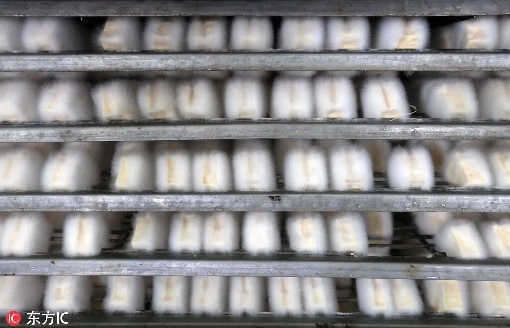 2016年11月30日,江苏省南通市石港古镇,工人在车间制作腐乳。图为酶房中正在进行菌种发酵的豆腐坯。图片:东方IC