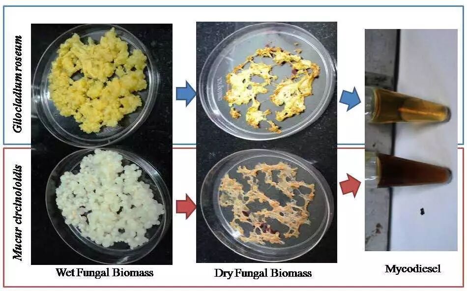 最右图为从真菌菌丝培养物中提取出的油脂,可用作转化为生物柴油的原料。图片:International Journal of Energy and Environment