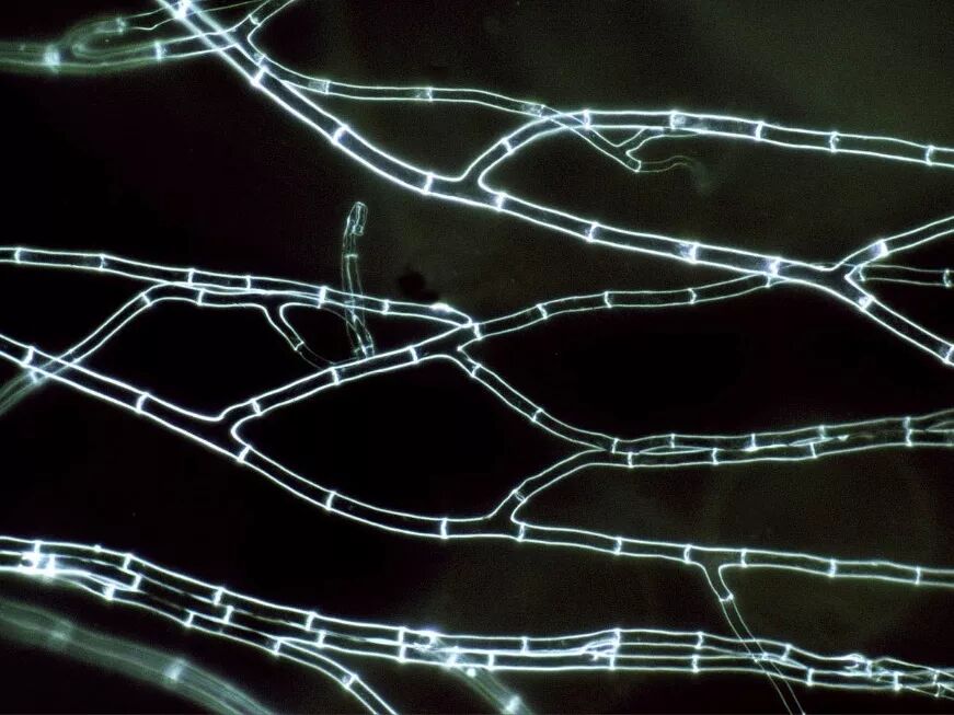 “高等”之处就在于多数物种的菌丝中有隔膜将之有规律地分隔成一个个隔间,每一隔间内均有2个不融合的细胞核。图为子囊菌门下粪生粪壳菌(Sordaria fimicola)的有规律分隔的菌丝。图片:George Barron