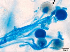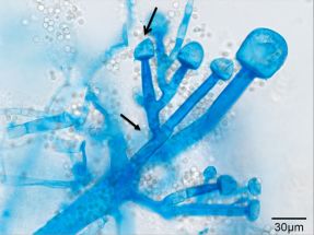 显微镜下雅致放射毛霉的孢子囊和孢囊梗。图片:Journal of Clinical Microbiology