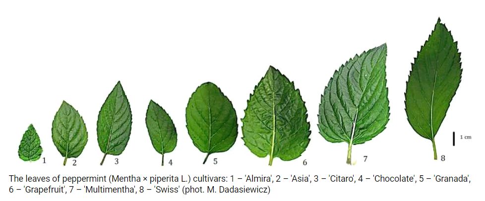 不同辣薄荷品种的叶形。图片:Kiełtyka-Dadasiewicz A. et al. (2017) Acta Sci. Pol. Hortorum Cultus 16(3):151–161
