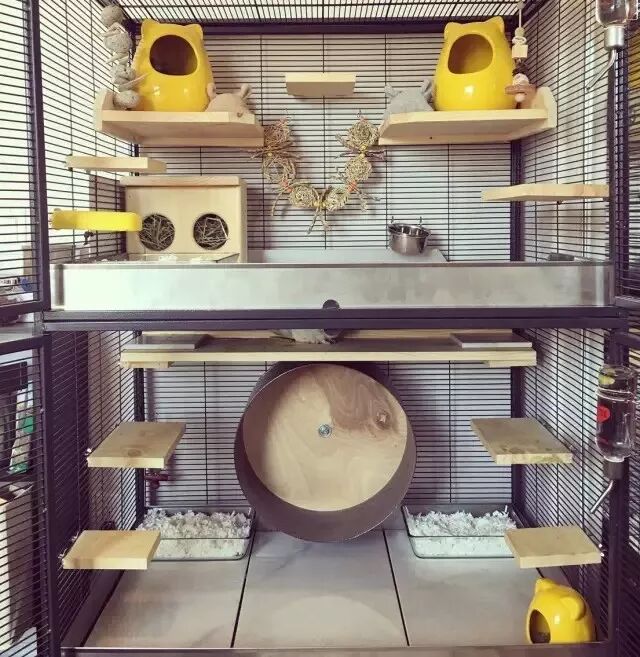 笼子里还可以搭几个不同高度的木头跳板、玩具等,再安个木头房子给它睡觉。因为啮齿类动物的门齿是终生生长的,需要不断啃咬,所以这些木头玩意都是消耗品,得不时更换。笼子底部得有专门的踏板,直接踩在钢丝上对它的足部健康有害。