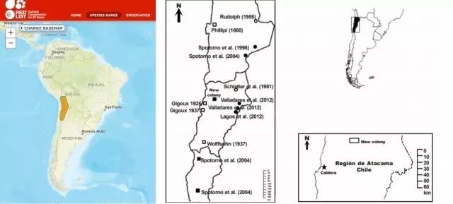 大龙猫的分布区看起来好像还算乐观(左),实际上只剩下几个孤岛了——图中的黑点意为此处有大龙猫的野外分布记录(右)。图片:IUCN ;P. Valladares et al. / Animal Biodiversity and Conservation (2014)
