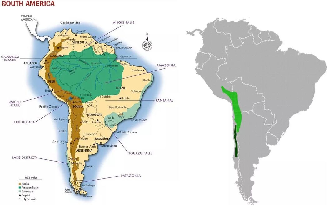 左图的棕色区域是曾经到处都有龙猫分布的安第斯山脉;而右图中是大、小龙猫的理论分布范围,深绿色的是小龙猫,浅绿色的是大龙猫。图片:waymarinc.com ; The Illusional Ministry / wikipedia