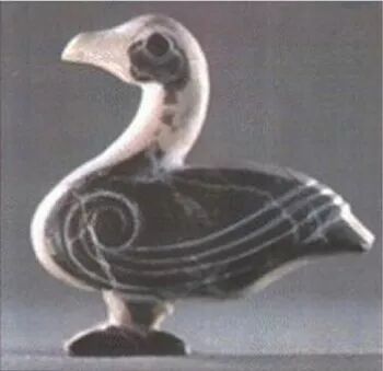 然而,这两件彩绘陶鸭还不是我国出土文物当中最早跟鸭有关的器物。其实,早在商周时期的玉器和青铜器中就已经出现了似鸭的艺术形象。1975年,河南安阳小屯殷墟出土了一件商代晚期的石鸭,造型朴实而生动。当时的人们应该对鸭子有了很好的观察,才会对其形态有如此传神的表达。那么,这是否说明商代已经实现了家鸭的驯养呢?